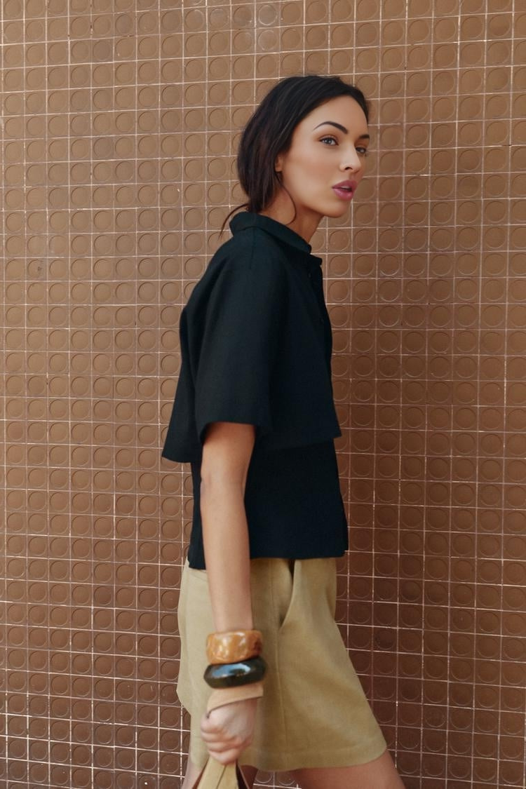 MATERIAL: Fitted shirt made of linen. Lapel collar and short sleeves. Double layer fabric detail. Front button closure.